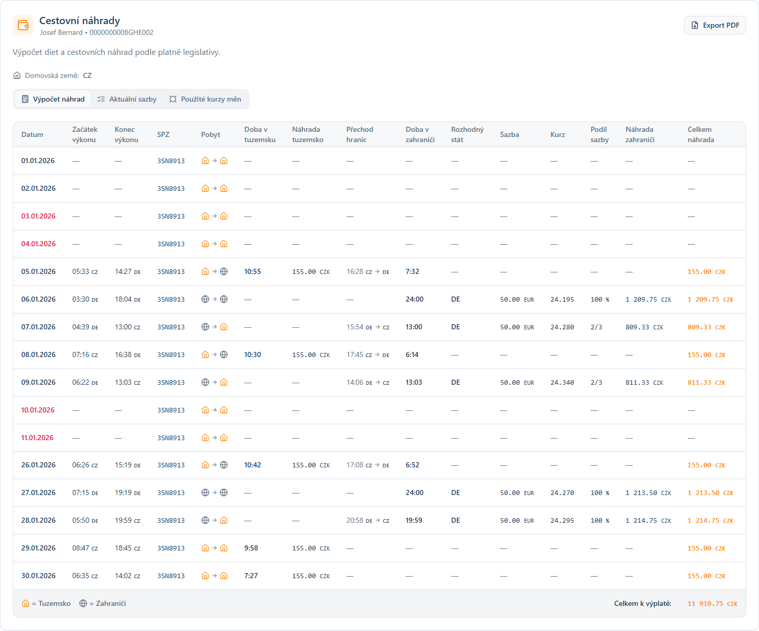 - výpočet zahraniční náhrady (dle aktuální sazeb a kurzů CZ i SK),